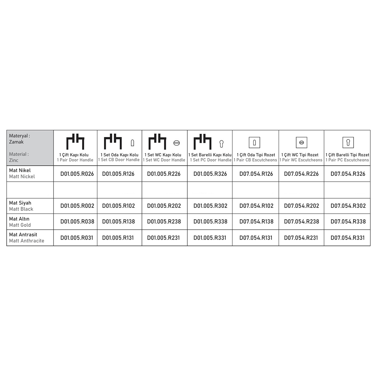 | Renk | Mat Altın, Mat Antrasit, Mat Nikel, Mat Siyah |