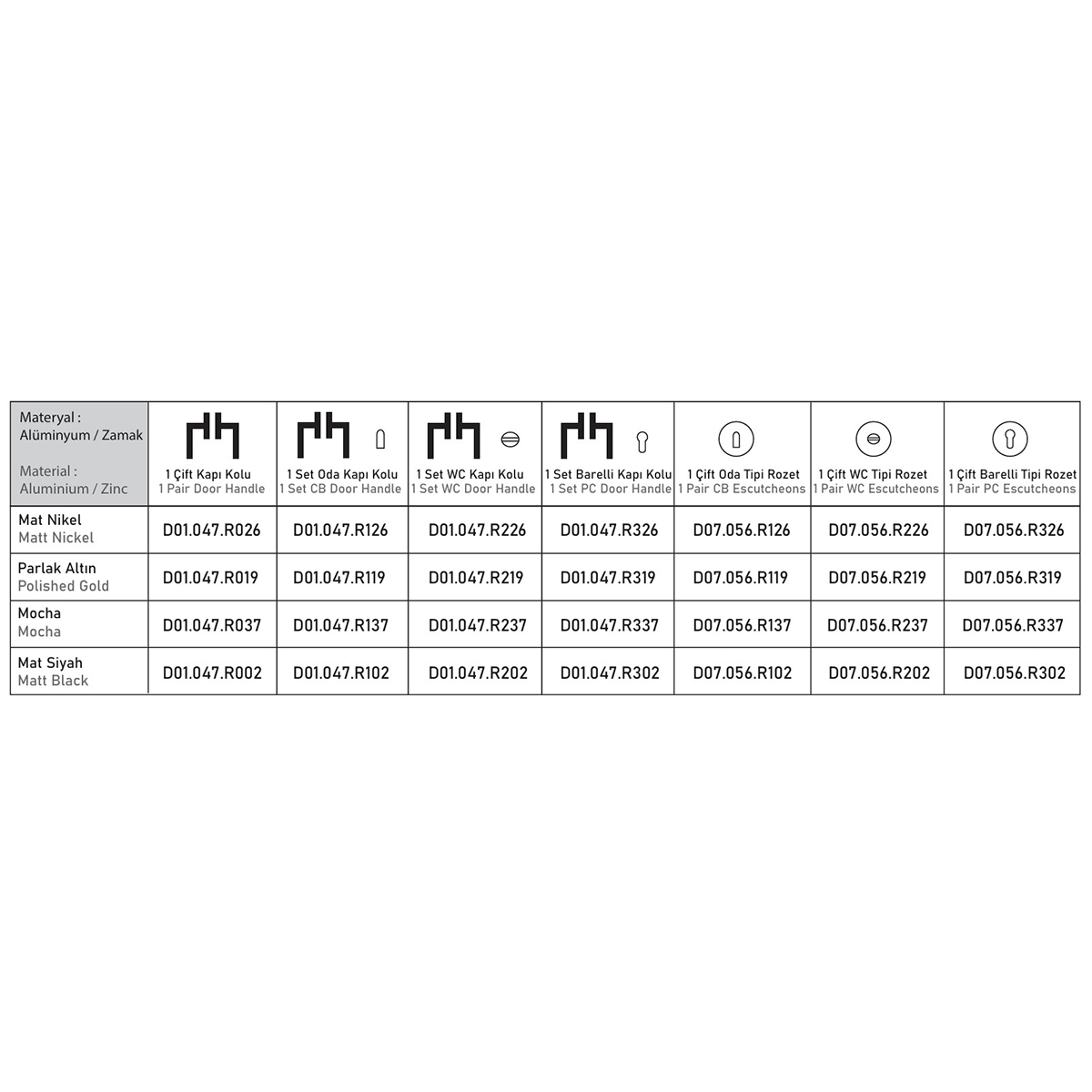 | Renk | Mat Nikel, Mat Siyah, Mocha, Parlak Altın |