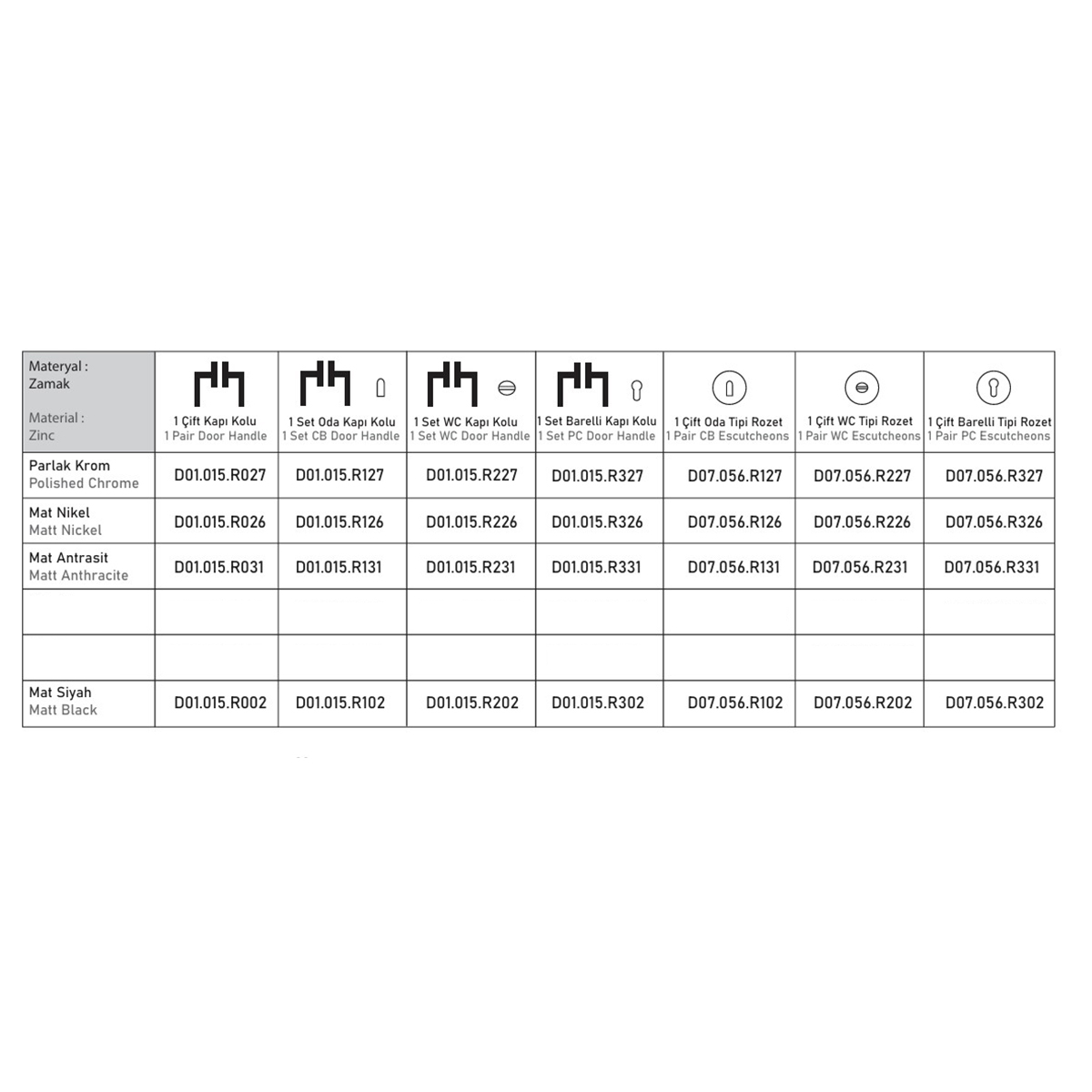 | Renk | Mat Antrasit, Mat Nikel, Mat Siyah, Parlak Krom |