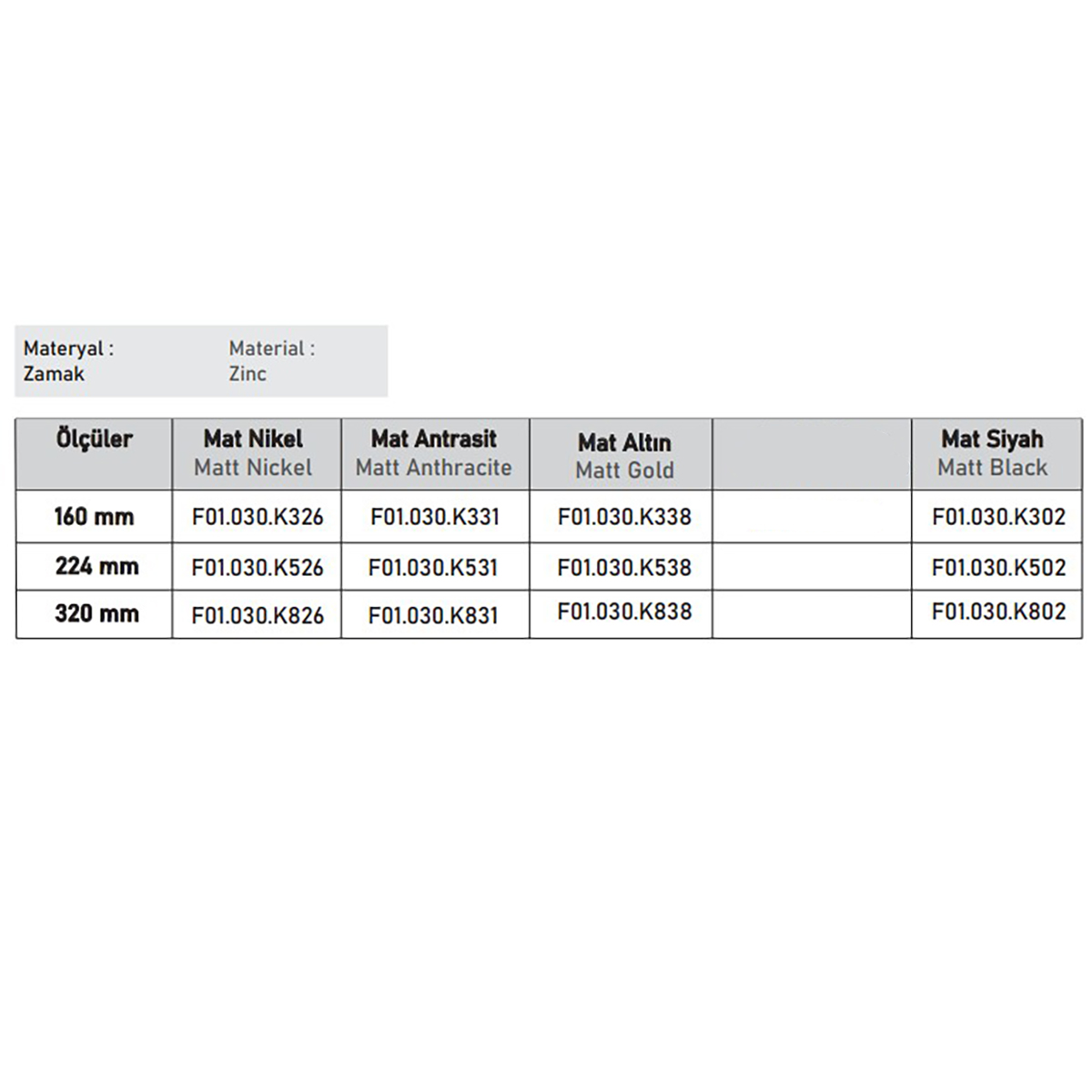 | Renk | Antrasit, Mat Altın, Mat Nikel, Mat Siyah |