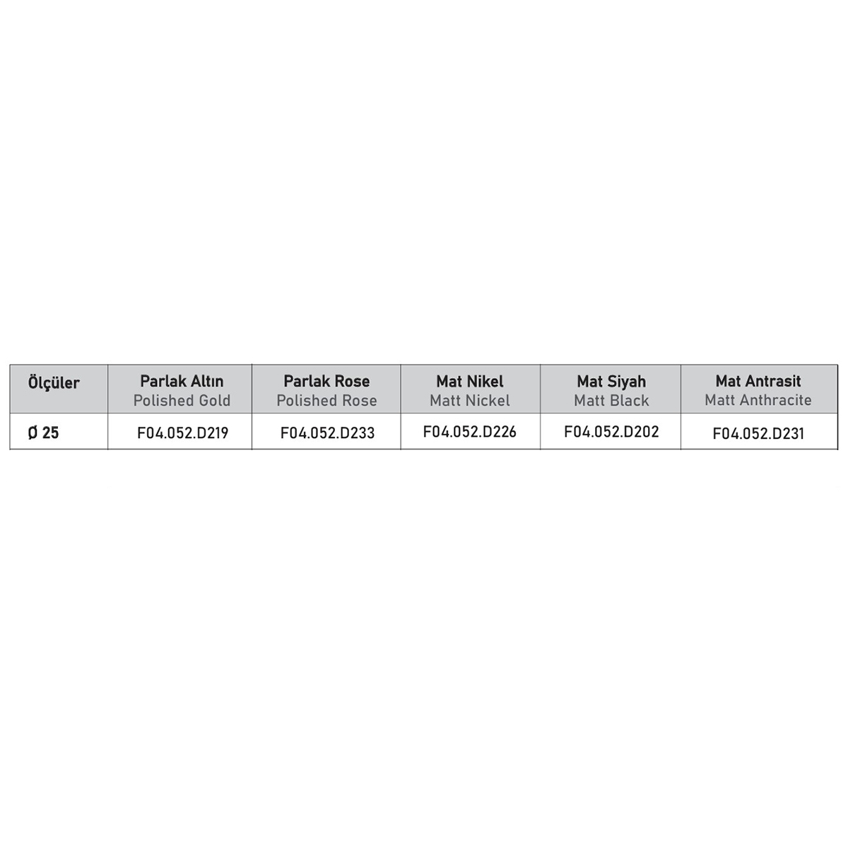 | Renk | Mat Antrasit, Mat Nikel, Mat Siyah, Parlak Altın, Parlak Rose |